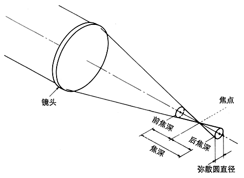 在焦点前后,光线开始聚集和扩散,点的影象变成模糊的,形成一个扩大的圆,这个圆就叫做弥散圆。在现实当中,观赏拍摄的影象是以某种方式(比如投影、放大成照片等等)来观察的,人的肉眼所感受到的影象与放大倍率、投影距离及观看距离有很大的关系,如果弥散圆的直径小于人眼的鉴别能力,在一定范围内实际影象产生的模糊是不能辨认的。这个不能辨认的弥散圆就称为容许弥散圆(permissible circleofconfusion)。
